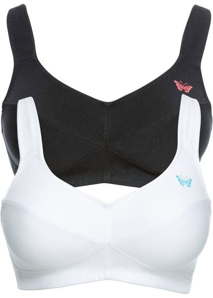 Wygodny biustonosz z bawełny organicznej w 2-paku. W kompl. 2 biustonosze z bawełny organicznej zachwycające swoim wysokim komfortem noszenia. Bez fiszbinów, na szerokich, wyściełanych ramiączkach. Zdobione małym nadrukiem z motywem motyla.