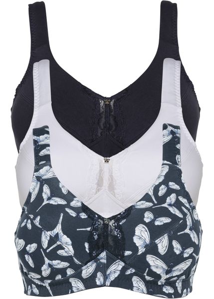 Biustonosz bez fiszbinów z bawełny organicznej w praktycznym zestawie 3 szt. Wygodny biustonosz z miękkiej bawełny organicznej zdobionej modnym nadrukiem. Mostek z ozdobną koronką i kokardką.