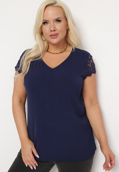 Granatowa Bluzka z Krótkimi Rękawami z Delikatnej Koronki Verlina