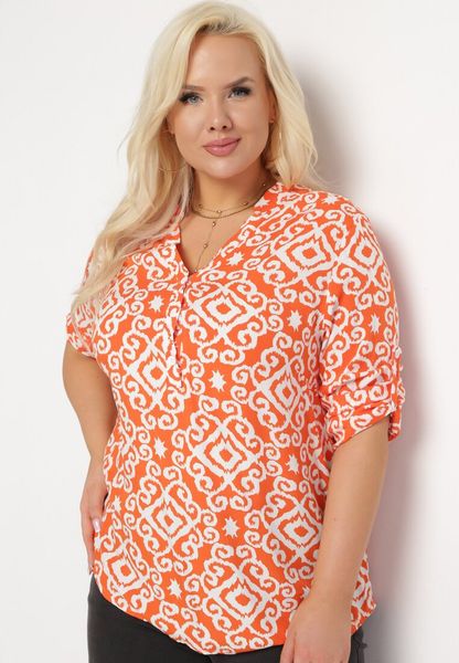 Pomarańczowo-Biała Wiskozowa Bluzka Zapinana na Guziki w Geometryczny Print Perita