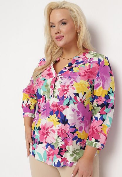 Różowa Bluzka z Wiskozy w Kolorowe Kwiaty z Zapinanym Dekoltem Nexia