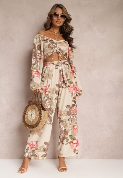Beżowy 2-częściowy Komplet Bluzka z Długim Rękawem Szerokie Spodnie z Gumką w Pasie w Kwiaty Calaq