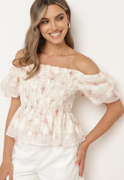 Beżowo-Różowa Bluzka z Marszczeniem Ozdobiona Falbanką i Siateczką o Kwiatowym Wzorze Felviana