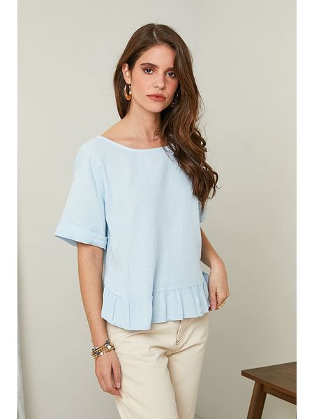 – czysty len- dekolt: okrągły- zapięcie: guzik na plecach- detale: falbanki- krój: prosty- look: jednokolorowy