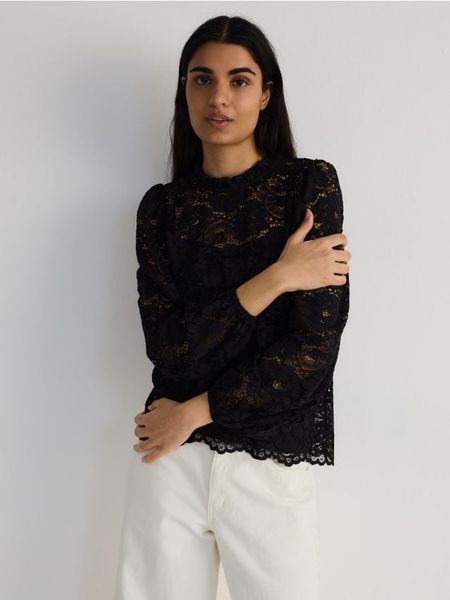 Bluzka o swobodnym kroju, wykonana z koronkowej dzianiny.