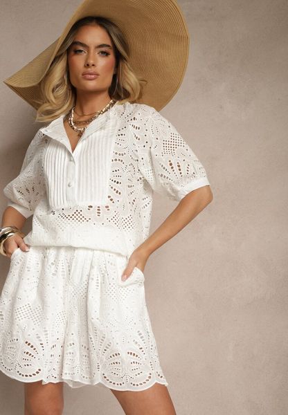 Biały Ażurowy Komplet z Szortami i Bluzką z Wiskozy i Bawełny Haloniela