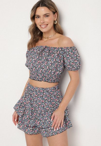 Czarno-Niebieski Komplet Bluzka Hiszpanka i Spódnico-Spodenki z Falbankami Sadelissea