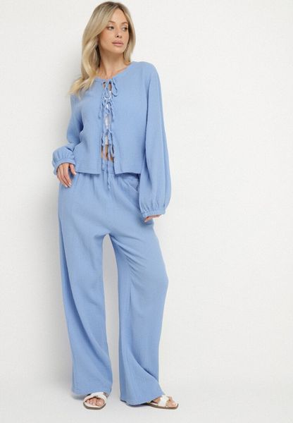 Niebieski Bawełniany Komplet Bluzka z Wiązaniem i Spodnie Palionis