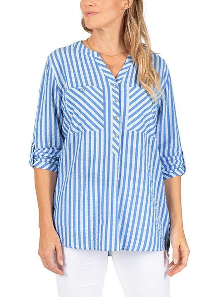 – dekolt: z rozcięciem- zapięcie: skrócona listwa guzikowa- kieszenie: na piersi- krój: prosty- wzór: paski