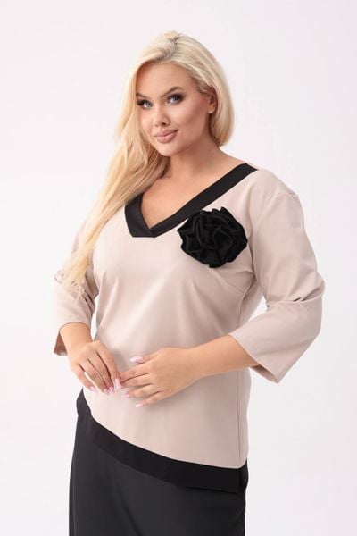 Asymetryczna bluzka Magdalena z odpinanym kwiatem i rękawem 3/4 PLUS SIZE XXL OVERSIZE JESIEŃ