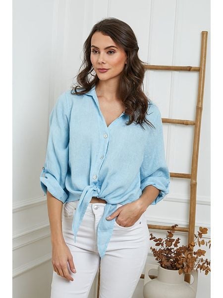 – czysty len- kołnierz: kent- dekolt: V- zapięcie: listwa guzikowa- zakończenie rękawów: patka i guzik- detale: ozdobne wiązanie- krój: prosty- look: jednokolorowy