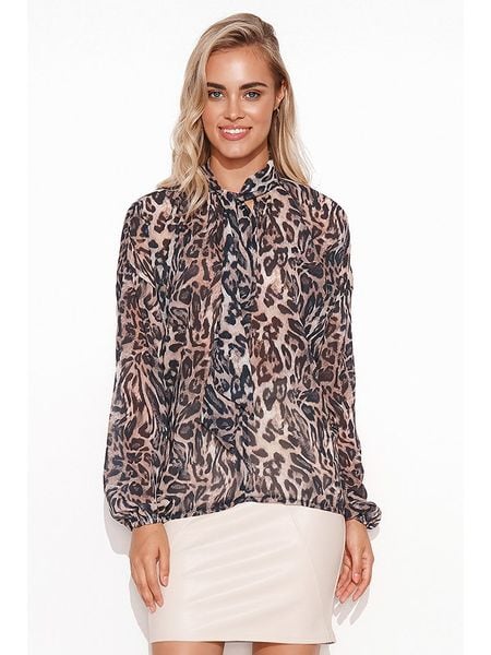 – kołnierz: stójka- dekolt: V- długość rękawa: długi – zakończenie rękawów: elastyczne- detale: ozdobne wiązanie- krój: prosty- wzór: panterka