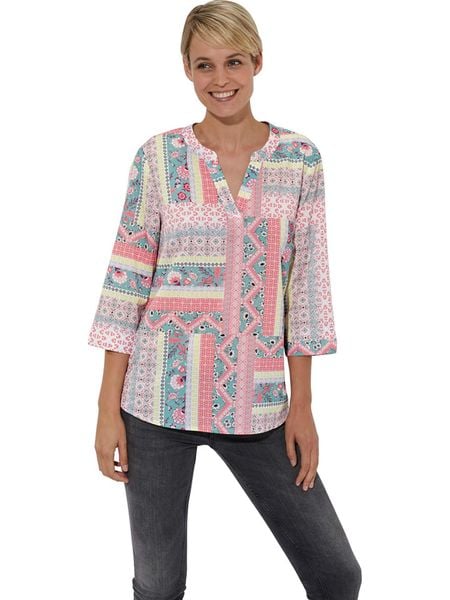 – dekolt: V- długość rękawa: 7/8- krój: prosty- dolny brzeg: zaokrąglony- wzór: na całości