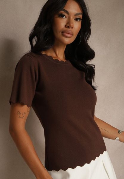Brązowa Dzianinowa Bluzka z Nieregularnymi Krawędziami Datria