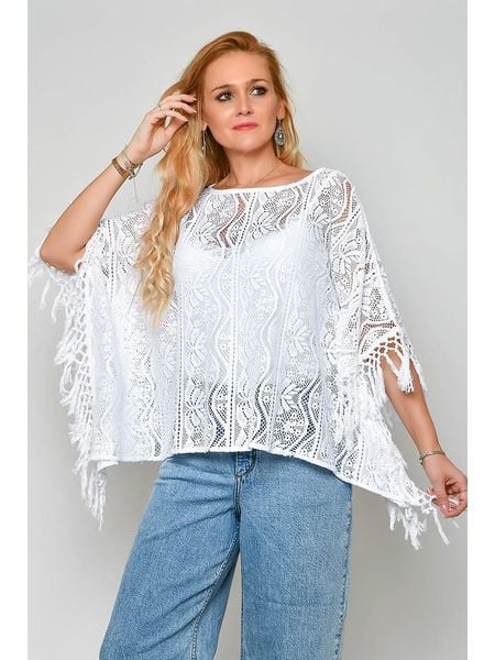 – czysta bawełna- dekolt: okrągły- krój rękawów: nietoperz- detale: koronka, frędzle- krój: prosty- look: jednokolorowy- wykończenie: prześwitujące