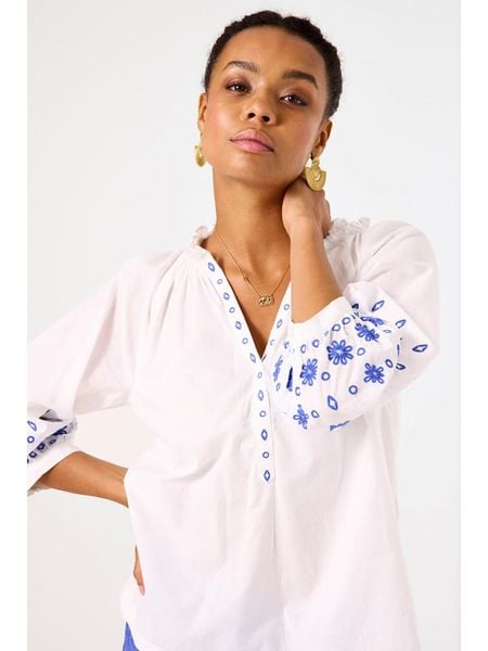 – czysta bawełna- kołnierz: stójka- dekolt: V- rękaw: bufiasty- długość rękawa: 3/4- krój: prosty- detale: aplikacje- look: jednokolorowy