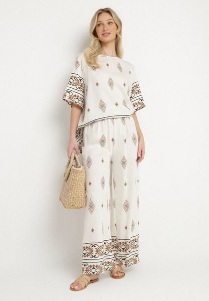 Beżowy Komplet Wiskozowy Bluzka i Spodnie w Boho Wzór Divenna
