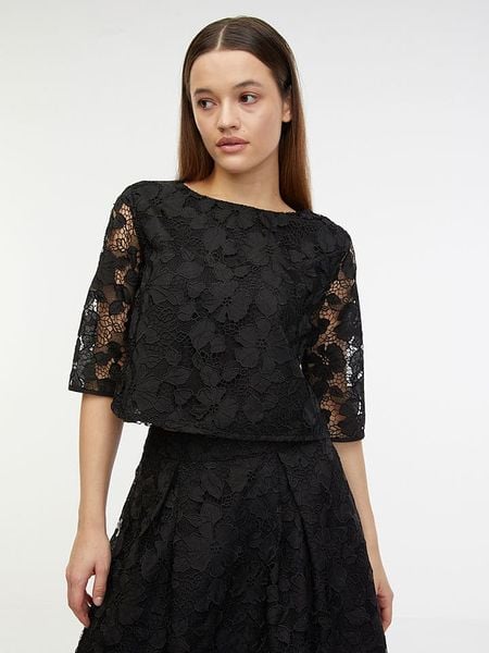 – dekolt: okrągły- zapięcie: guziki na plecach- długość rękawa: półdługi- detale: szydełkowana koronka- krój: cropped- look: jednokolorowy