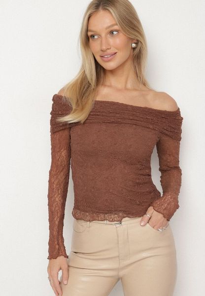 Brązowa Koronkowa Bluzka z Odkrytymi Ramionami i Długimi Rękawami Unena