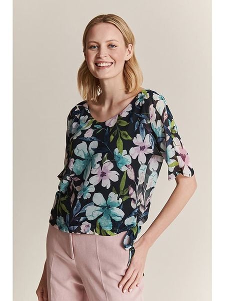 – dekolt: V- długość rękawa: półdługi – detale: ozdobne wiązanie- krój: prosty- wzór: kwiatowy