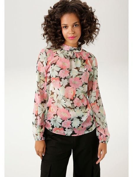 – kołnierz: stójka- zapięcie: guzik na plecach- rękaw: bufiasty- zakończenie rękawów: elastyczne- krój: prosty- wzór: kwiatowy