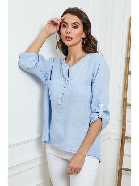 – czysty len- dekolt: z rozcięciem- zapięcie: skrócona listwa guzikowa- zakończenie rękawów: patka i guzik- krój: prosty- look: jednokolorowy