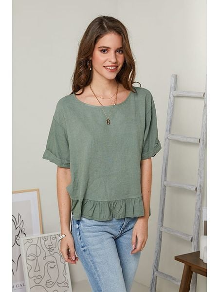 – czysty len- dekolt: okrągły- zapięcie: guzik na plecach- detale: falbanki- krój: prosty- look: jednokolorowy