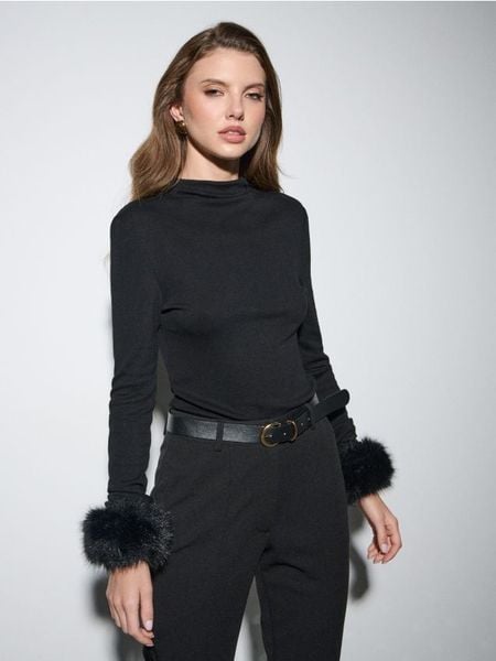 Sinsay – Bluzka z ozdobnym futerkiem – czarny –