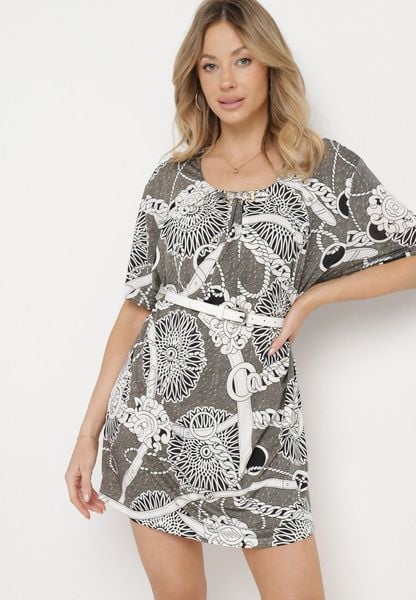 Szara Elastyczna Bluzka z Krótkim Rękawem z Oryginalnym Nadrukiem i Klamrą Dordria