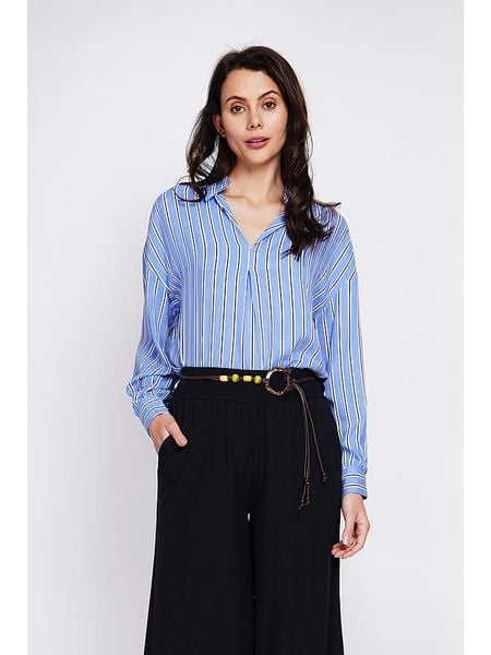 – dekolt: V- kołnierz: cutaway- zakończenie rękawów: mankiet na guzik- krój: luźny- wzór: paskiWskazówka: Na metkach odzieży tej marki znajdują się rozmiary francuskie. Rozmiarówka została przez nas przeliczona. Podane do wyboru warianty rozmiarów odpowiadają standardowym europejskim rozmiarom konfekcji. Prosimy zapoznać się z zamieszczonym objaśnieniem rozmiarów: