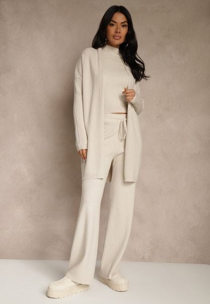 Beżowy Komplet z Dzianiny z Wiskozą Spodnie Bluzka ze Stójką i Kardigan Vetisene