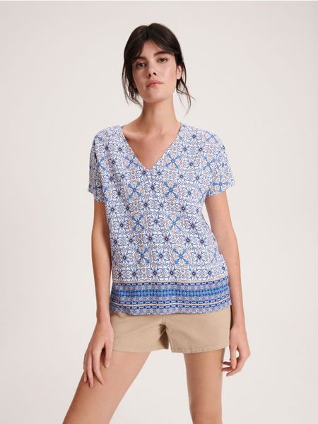 Bluzka o swobodnym kroju, wykonana z wiskozowej tkaniny.