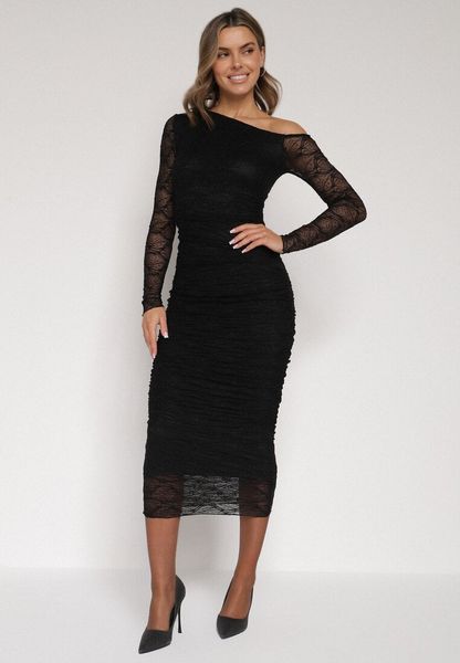 Czarny Koronkowy Komplet Dopasowana Spódnica i Bluzka na Jedno Ramię Calonara