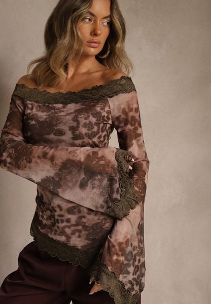 Brązowa Bluzka Siateczkowa Typu Hiszpanka z Bawełną i Wiskozą z Koronką Nurriva