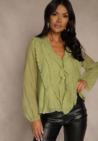 Zielona Koszulowa Bluzka z Dekoltem V i Falbankami Calomia