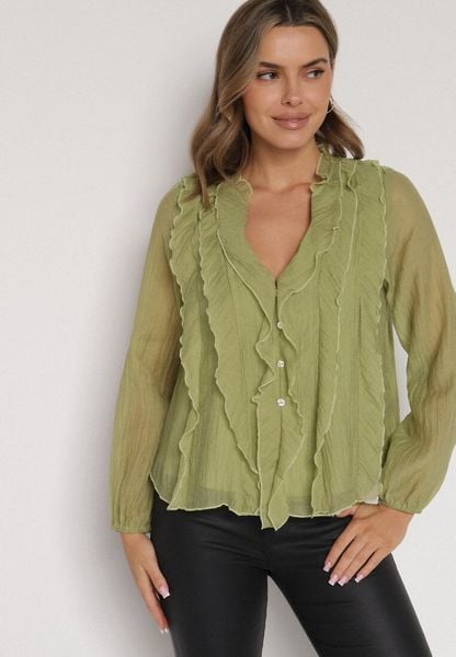 Zielona Bluzka Koszulowa z Dekoltem w Serek Zdobiona Falbankami Nailiphis