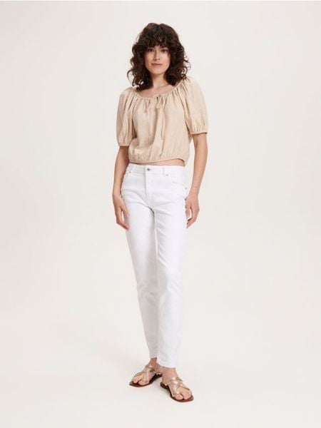 Bluzka o swobodnym fasonie, uszyta z tkaniny na bazie wiskozy z dodatkiem lnu.