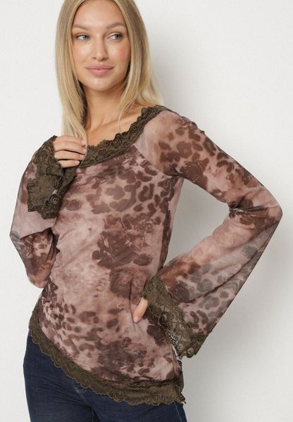 Brązowa Siateczkowa Bluzka Hiszpanka z Wiskozą i Bawełną Ozdobiona Koronką Nirriva