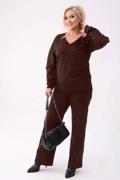Bawełniany komplet dresowy Comfy w kolorze gorzkiej czekolady – bluza z różą + długie spodnie PLUS SIZE XXL OVERSIZE JESIEŃ