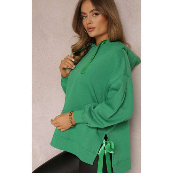 Bluza Liiza oversizowa, z tyłu lekko przedłużona. Dekorowana po bokach subtelnymi wycięciami z wiązaną tasiemką. Wykonana z bawełnianej tkaniny, całość utrzymana w jednolitej kolorystyce. Rękawy lekko bufiaste, zakończone ściągaczem. Kaptur wyposażony w szeroką taśmę do regulacji obwodu. Wykończona od środka polarem. Casualowa bluza hoodie to model, który nigdy nie wyjdzie z tredów!