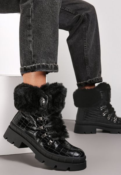 Czarne Botki w Krokodyli Wzór z Futerkiem Guenmon