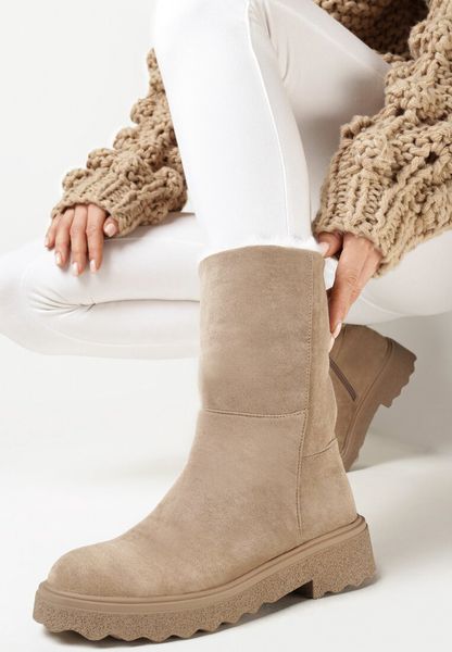 Ciemnobeżowe Botki z Ekozamszu na Płaskiej Podeszwie i Ozdobnym Futerkiem Hennie