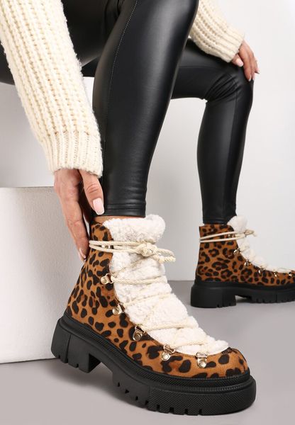 Brązowe Botki na Grubej Podeszwie z Ozdobnym Wiązaniem i Futerkiem Alloksi
