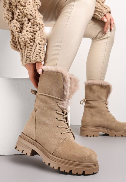 Ciemnobeżowe Sznurowane Botki z Ekozamszu z Wywiniętą Cholewką i Futerkiem Temis