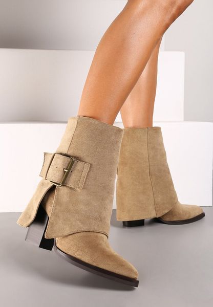 Ciemnobeżowe Botki Kowbojki na Słupku Ozdobione Wywiniętą Cholewką Ansinae