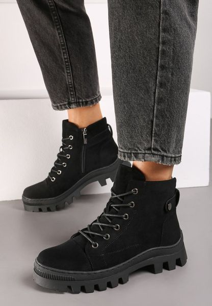 Czarne Botki na Grubej Podeszwie w Stylu Traperów ze Sznurowaniem Arviva