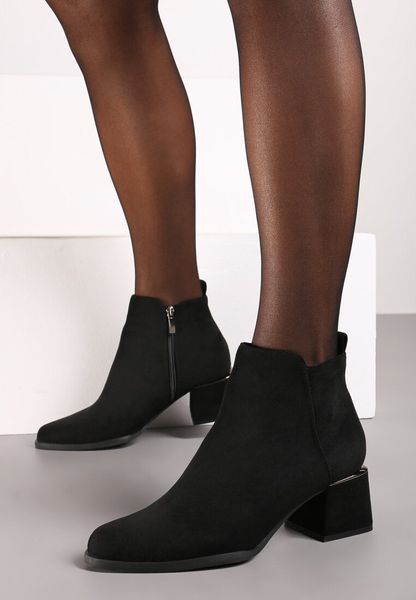 Czarne Botki z Imitacji Zamszu na Niskim Słupku z Metaliczną Wstawką Anorvia