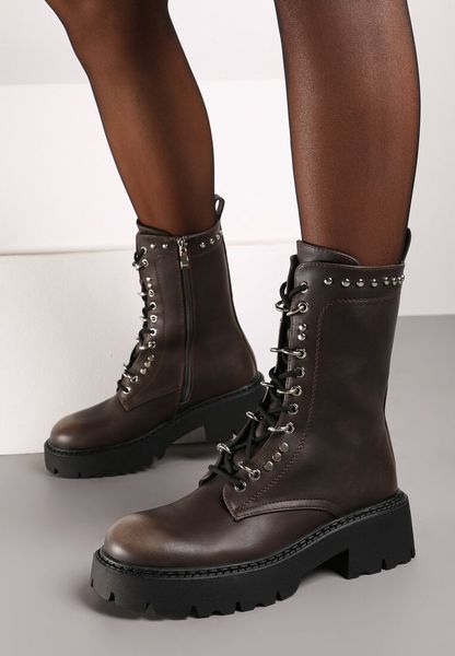 Brązowe Botki Workery z Ozdobnymi Nitami na Grubej Podeszwie Miataria