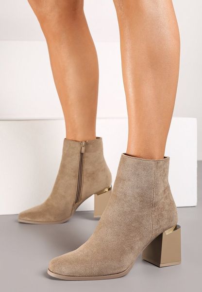 Ciemnobeżowe Botki z Imitacji Zamszu na Słupku z Metaliczną Wstawką Zinditha