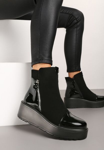 Czarne Botki na Koturnie z Lakierowanymi Wstawkami i Ozdobnym Suwakiem Lannovia